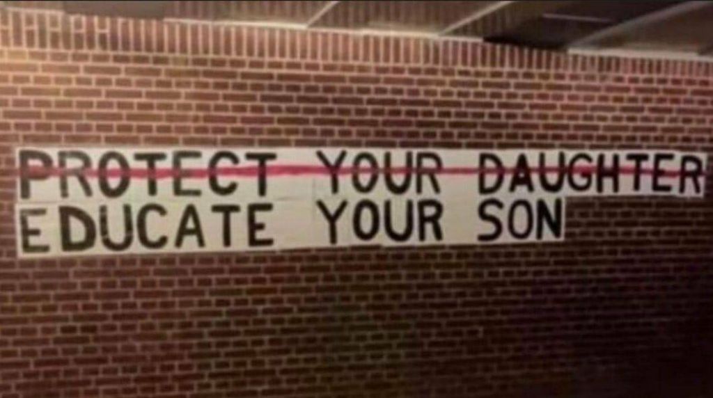 Ένα σύνθημα λέει: «Προστατέψτε την κόρη σας, εκπαιδεύστε τον γιο σας». Μόνο που το πρώτο μέρος της φράσης είναι σβησμένο.