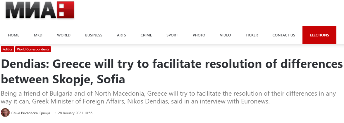 «Δένδιας: Η Ελλάδα θα προσπαθήσει να διευκολύνει την επίλυση των διαφορών Σκοπίων, Σόφιας» γράφει το κρατικό πρακτορείο ειδήσεων της Βόρειας Μακεδονίας