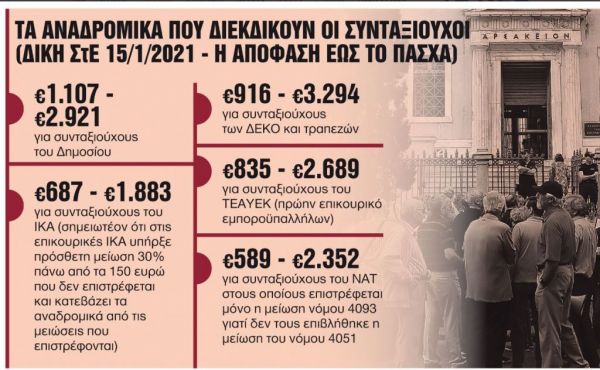 2. Η πληρωμή αναδρομικών στις επικουρικές για 400.000 συνταξιούχους που έχουν υποβάλει αγωγές ως τον Οκτώβριο του 2020 και πάντως όχι μετά τα αναδρομικά 11μήνου που πληρώθηκαν στις κύριες συντάξεις.