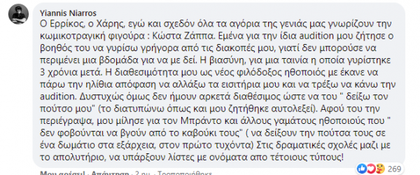 Τις καταγγελίες συμπληρώνει και επιβεβαιώνει ο ηθοποιός Γιάννης Νιάρρος.