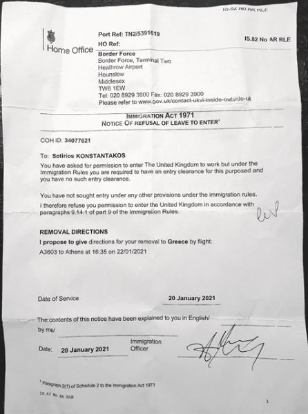 Το έγγραφο που επιδόθηκε στον Σωτήρη Κωνσταντάκο στο οποίο του γνωστοποιείται ότι δεν μπορεί {LF}να εισέλθει στη χώρα και διατάσσεται η επαναπροώθησή του στην Ελλάδα