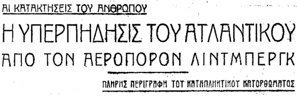 «Ο Κάρολος Λίντμπεργκ, ο ατρόμητος, ο πραγματικός τρελλός, ο άνθρωπος μυστήριον, επέρασε με το αεροπλάνον του τον ωκεανόν φθάσας από Νέας Υόρκης εις Παρισίους χωρίς κανένα σταθμόν και προσγειωθείς εις το αεροδρόμιον του Μπουρζέ, μεταξύ ενός πλήθους καταπλήκτου, ενθουσιώδους, συγκινημένου, κατεχομένου από όλα τα αισθήματα που δοκιμάζει η ψυχή του ανθρώπου εμπρός εις μίαν πρωτοφανή πράξιν τόλμης, θελήσεως, ενεργητικότητος.