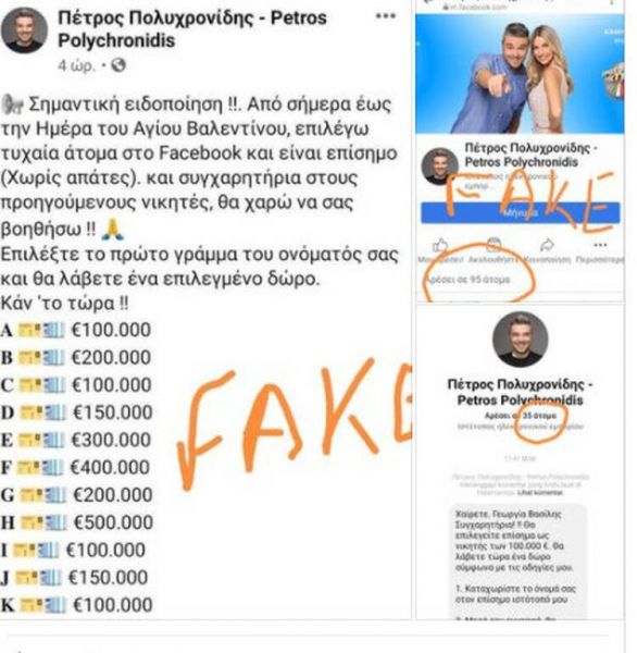 «ΠΡΟΣΟΧΗ: Από χθες κυκλοφορεί στο Facebook μια ψεύτικη σελίδα με το όνομα μου και τις φωτογραφίες μου με σκοπό την εξαπάτηση σας. ΓΙΑ ΝΑ ΤΗΝ ΞΕΧΩΡΙΣΕΤΕ από την αληθινή μπορείτε απλά να δείτε τον αριθμό των ακόλουθων της σελίδας που δεν υπερβαίνει τους 100 μιας και πρόλαβε να εξαπατήσει αυτούς τους ανθρώπους. Επίσης σας ζητά εγγραφές ΤΑΧΑ ΜΟΥ για να κερδίσετε μεγάλα χρηματικά ποσά. ΕΙΝΑΙ ΑΠΑΤΗ. ΠΑΡΑΚΑΛΩ ΚΑΝΤΕ ΑΝΑΦΟΡΑ ΣΤΗ ΣΥΓΚΕΚΡΙΜΕΝΗ ΣΕΛΙΔΑ (που δημιουργήθηκε μόλις εχθές)» έγραψε αναφέροντας και το link της σελίδας.