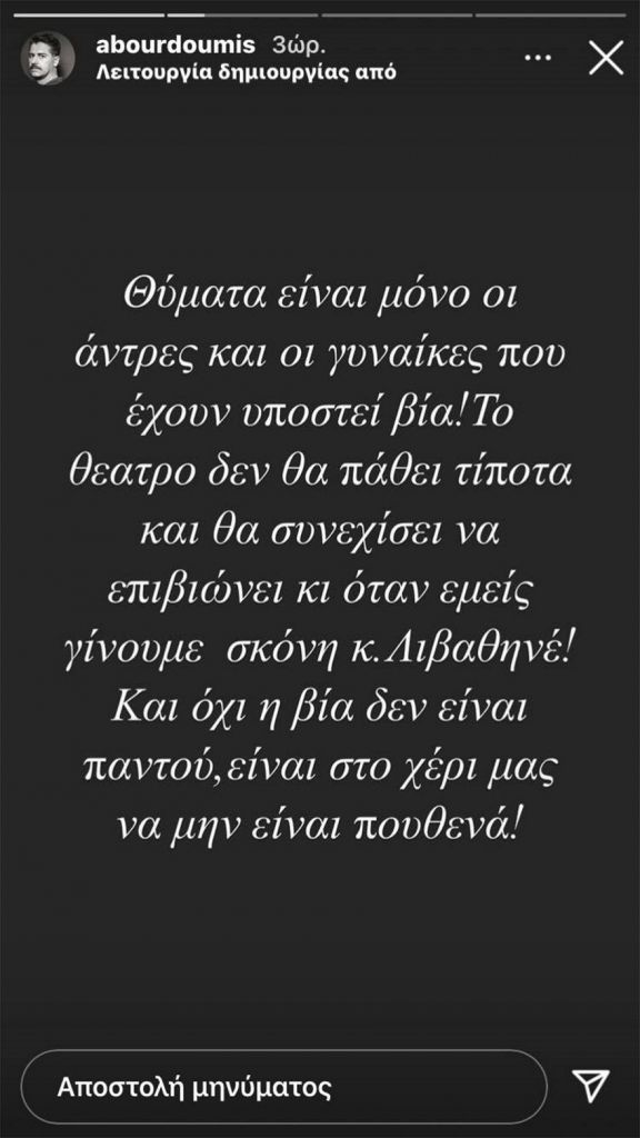 «Θύματα είναι μόνο οι άντρες και οι γυναίκες που έχουν υποστεί βία! Το θέατρο δεν θα πάθει τίποτα και θα συνεχίσει να επιβιώνει κι όταν εμείς γίνουμε σκόνη κ. Λιβαθινέ! Και όχι η βία δεν είναι παντού, είναι στο χέρι μας να μην είναι πουθενά.