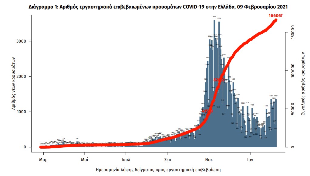 Έτσι, σύμφωνα με την ανακοίνωση του ΕΟΔΥ, ο συνολικός αριθμός των κρουσμάτων ανέρχεται στα 166.067, εκ των οποίων 51.9% άνδρες. Κατά την ιχνηλάτιση βρέθηκε ότι 6.061 (3.6%) θεωρούνται σχετιζόμενα με ταξίδι από το εξωτερικό και 52.913 (61.0%) είναι σχετιζόμενα με ήδη γνωστό κρούσμα.