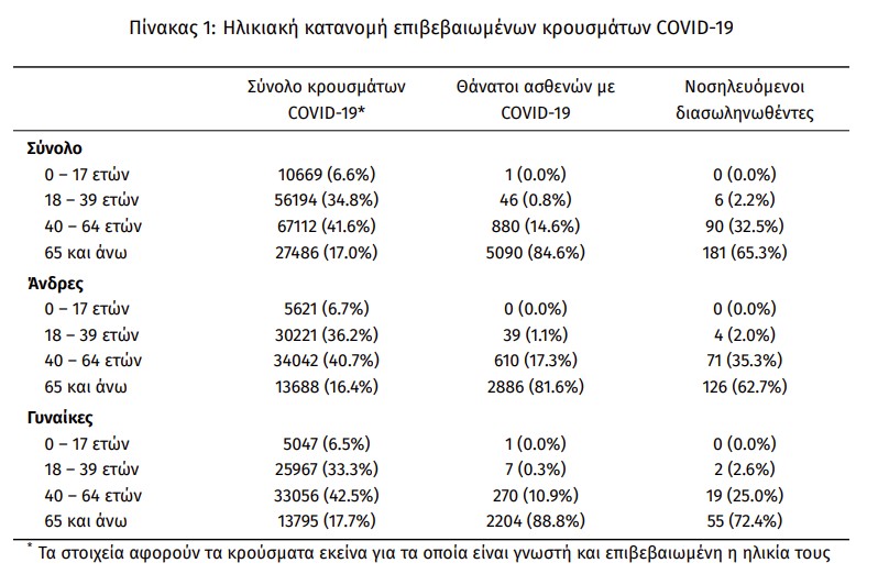 Η διάμεση ηλικία των κρουσμάτων είναι 44 έτη (εύρος 0.2 έως 105 έτη), ενώ η διάμεση ηλικία των θανάτων είναι 79 έτη (εύρος 15 έως 103 έτη). Η ηλικιακή κατανομή των (α) συνολικών κρουσμάτων, (β) των περιστατικών που κατέληξαν σε θάνατο και (γ) των ασθενών που νοσηλεύονται διασωληνωμένοι, είναι η ακόλουθη: