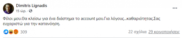«Φίλοι μου. Θα κλείσω για ένα διάστημα το account μου. Για λόγους…καθαριότητας. Σας ευχαριστώ για την κατανόηση», αναφέρει.