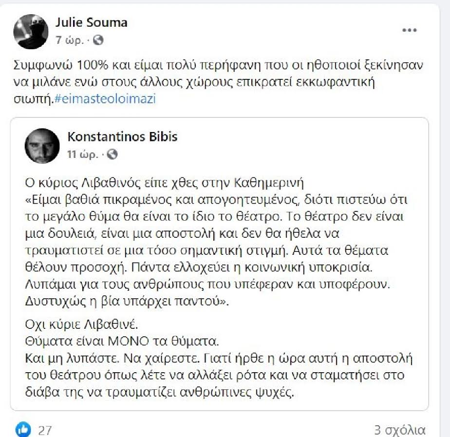 Η ηθοποιός κοινοποίησε την ανάρτηση του συναδέλφου της Κωνσταντίνου Μπιμπή, ο οποίος έγραψε: «Ο κύριος Λιβαθινός είπε χθες στην Καθημερινή. «Είμαι βαθιά πικραμένος και απογοητευμένος, διότι πιστεύω ότι το μεγάλο θύμα θα είναι το ίδιο το θέατρο. Το θέατρο δεν είναι μια δουλειά, είναι μια αποστολή και δεν θα ήθελα να τραυματιστεί σε μια τόσο σημαντική στιγμή. Αυτά τα θέματα θέλουν προσοχή. Πάντα ελλοχεύει η κοινωνική υποκρισία. Λυπάμαι για τους ανθρώπους που υπέφεραν και υποφέρουν. Δυστυχώς η βία υπάρχει παντού». Όχι κύριε Λιβαθινέ. Θύματα είναι μόνο τα θύματα. Και μη λυπάστε. Να χαίρεστε. Γιατί ήρθε η ώρα αυτή η αποστολή του θεάτρου όπως λέτε να αλλάξει ρότα και να σταματήσει στο διάβα της να τραυματίζει ανθρώπινες ψυχές».