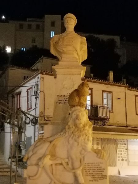 Επιστρέφουμε προς την άλλη πλευρά του λιμανιού, με κατεύθυνση το ανοιχτό ακόμα ψητοπωλείο. Πέφτουμε πάνω σε μία σπάνια συνάντηση ενός πραγματικού και ενός σκαλιστού αιλουροειδούς, μπροστά από την προτομή του ήρωα των Βαλκανικών Πολέμων, ναυάρχου Παύλου Κουντουριώτη.
