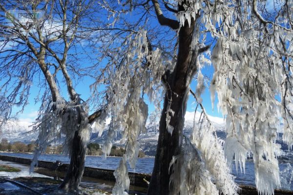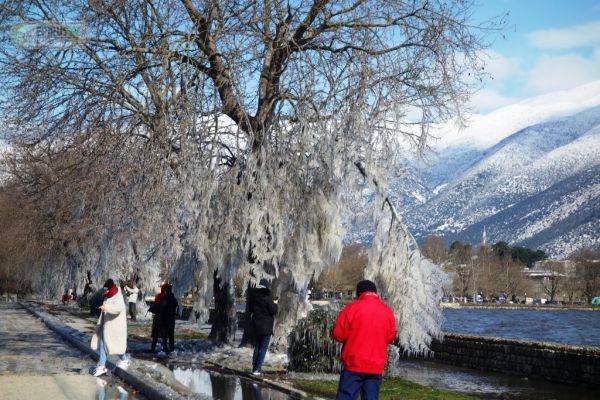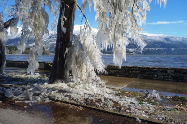 Εκτός όμως από την επικινδυνότητα που έχει δημιουργήσει ο παγετός για οδηγούς και πεζούς η φύση έκανε το θαύμα της δημιουργώντας τα δικά της «γλυπτά» πλάι στη λίμνη.