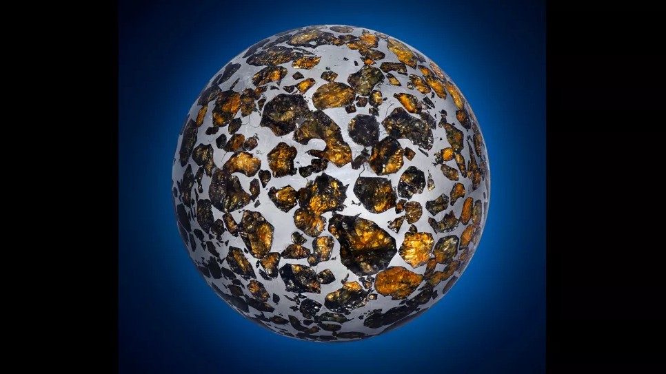 Εντυπωσιακοί κρύσταλλοι ολιβίνη και περίδοτου έχουν παγιδευτεί μέσα στην πέτρα σε τμήμα του μετεωρίτη Seymchan από τη Σιβηρία (© Christie’s Images)