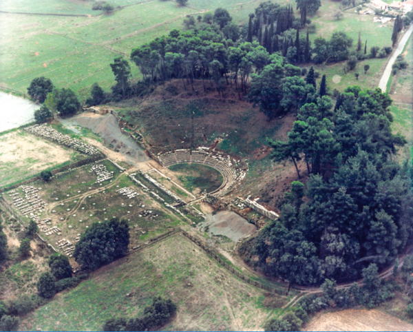 Το θέατρο, χτισμένο τον 4ο αιώνα π.Χ., ήταν κατά τον Παυσανία το μεγαλύτερο της αρχαιότητας, με χωρητικότητα 18.000-20.000 θεατών. Στην ορχήστρα υπήρχε πέτρινη κατασκευή, για να σύρονται τα σκηνικά. Εδώλια διατηρούνται μόνο στο κατώτερο τμήμα του κοίλου. Το θέατρο χρησιμοποιήθηκε όχι μόνο για θεατρικές παραστάσεις αλλά και για πολιτικές συγκεντρώσεις.