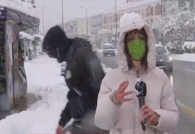 Την ώρα που η δημοσιογράφος μετέφερε το ρεπορτάζ, μία παρέα πιτσιρικάδων τής «επιτέθηκε» με χιονόμπαλα