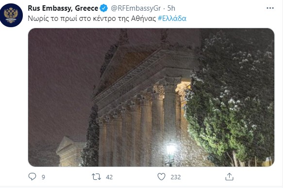 Η ρωσική πρεσβεία ανεβάζει σειρά φωτογραφιών με τη χιονόπτωση στην Αθήνα και πλάνα από διάφορα ιστορικά μνημεία και άλλα χαρακτηριστικά σημεία της πόλης. Επίσης, αναρτά φωτογραφίες από τις χιονισμένες Αθήνα και Μόσχα δίπλα-δίπλα.