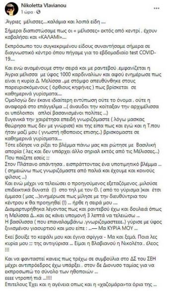 H Νικολέτα Βλαβιανού δείχνει την Κατερίνα Διδασκάλου -χρησιμοποιεί τον όρο Μέλισσα Δ. που παραπέμπει στο επώνυμο της πρωταγωνίστριας της σειράς – και περιγραφές του τύπου επιδεικτικά, ξινισμένου γιαρτιού, αρχιμέλισσα για να εξιστορήσει το επεισόδιο που υπήρξε στην ουρά για τα τεστ Covid.