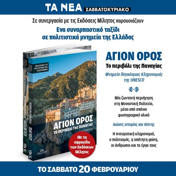 ΤΑ ΝΕΑ Σαββατοκύριακο σε συνεργασία με τις Εκδόσεις Μίλητος παρουσιάζουν ένα συναρπαστικό ταξίδι σε πολιτιστικά μνημεία της Eλλάδας: «Αγιο Ορος», μία ζωντανή περιήγηση στη Μοναστική Πολιτεία.