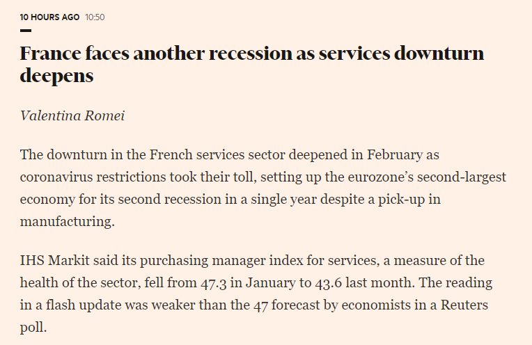 Η οικονομία της Γαλλίας συρρικνώθηκε 1,3% το τελευταίο τρίμηνο του 2020 σε σύγκριση με τους προηγούμενους τρεις μήνες. Οι δείκτες PMI υποδηλώνουν ότι η δεύτερη μεγαλύτερη οικονομία της ευρωζώνης θα μπορούσε να αντιμετωπίσει τη δεύτερη ύφεσή της σε λιγότερο από ένα χρόνο.