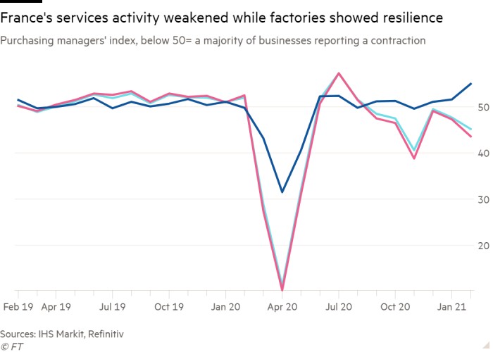 Τα στοιχεία, με βάση τα δεδομένα που συλλέχθηκαν μεταξύ 11 και 18 Φεβρουαρίου, υποδηλώνουν ότι ο γαλλικός ιδιωτικός τομέας συνεχίζει να αγωνίζεται να επιβιώσει από την κρίση του κορωνοϊού, δήλωσε στους Financial Times ο Έλιοτ Κερ, οικονομολόγος της IHS Markit.