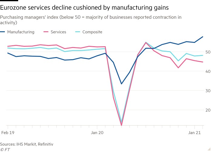 Η συρρίκνωση του κλάδου των υπηρεσίων των Φεβρουάριο παρατηρήθηκε γενικά σε ολόκληρη την Ευρωζώνη, περιορισμοί κρατούν κλειστά τα περισσότερα μπαρ και εστιατόρια στις χώρες του μπλοκ. Παρ’ όλα αυτά τα εργοστάσια επιτάχυναν τη ανάπτυξη σε αποκλίνουσες επιδόσεις που ωφελούν τις κατασκευαστικές οικονομίες όπως της Γερμανίας.