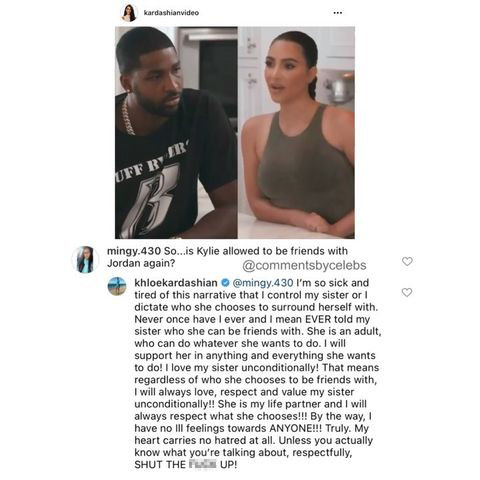 «Λοιπόν, θα αφήσεις την Κάιλι να ξαναγίνει φίλη με την Τζορντίν;», έγραψε η σχολιάστρια, με την Καρντάσιαν να απαντά: «Έχω σιχαθεί αυτό το αφήγημα ότι ελέγχω την αδερφή μου ή της λέω ποιους μπορεί να έχει γύρω της».