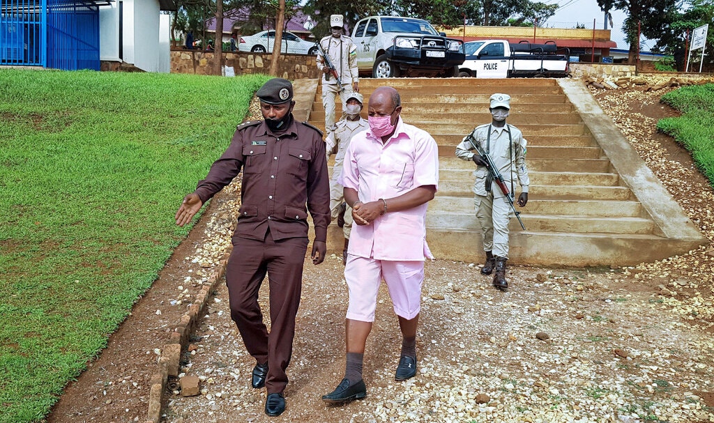 Ο κ. Rusesabagina – με μάσκα, ντυμένος με ροζ στολή φυλακής και με έναμπλε σημειωματάριο – έφτασε στο δικαστήριο με 20 συνηγόρους.