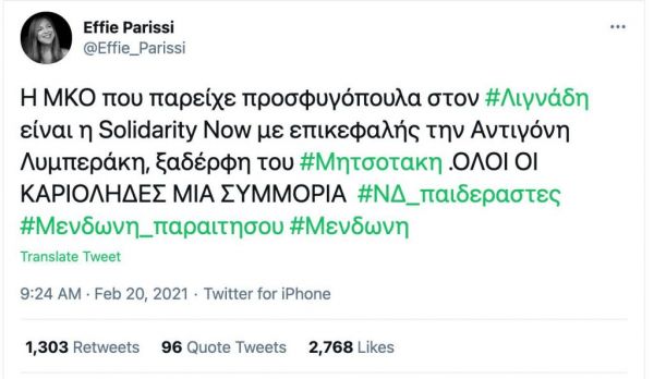 Ένα από τα post που έκαναν την αρχή ήταν κι αυτό που αυθαιρέτως, χωρίς κανένα στοιχείο δηλαδή, έγραφε: «Η ΜΚΟ που παρείχε προσφυγόπουλα στον Λιγνάδη είναι η Solidarity Now, με επικεφαλής την Αντιγόνη Λυμπεράκη, ξαδέρφη του Μητσοτάκη. Ολοι οι καργιόληδες μια εταιρεία», έγραψε και μάλιστα tagαρε και «ΝΔ, παιδεραστές, Μενδώνη παραιτήσου».