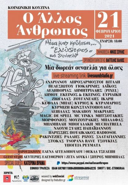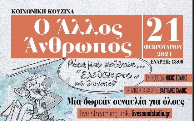 Η κοινωνική κουζίνα «Ο Άλλος Άνθρωπος» με τις αμέτρητες δράσεις αλληλεγγύης διοργανώνει μια διαδικτυακή συναυλία με αγαπημένους καλλιτέχνες και καλλιτέχνιδες.