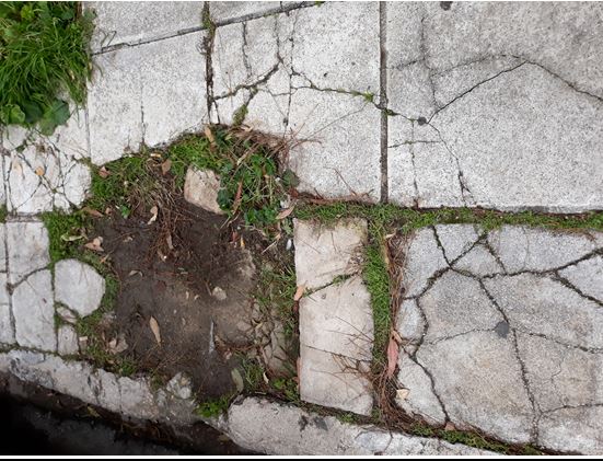 Ένας από τους πλησιέστερους προς την κεντρική πλατεία της Νέας Σμύρνης δρόμους, η οδός Μεγάλου Αλεξάνδρου με το διαλυμένο στα πεζοδρόμια πλακόστρωτο, που παγιδεύει με ατυχήματα τους πεζοπόρους.
