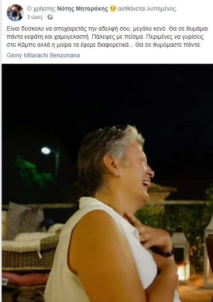 «Είναι δύσκολο να αποχαιρετάς την αδελφή σου, μεγάλο κενό. Θα σε θυμάμαι πάντα κεφάτη και χαμογελαστή. Πάλεψες με πείσμα. Περιμένες να γυρίσεις στο Κάμπο αλλά η μοίρα τα έφερε διαφορετικά… Θα σε θυμόμαστε πάντα», έγραψε ο Νότης Μηταράκης.