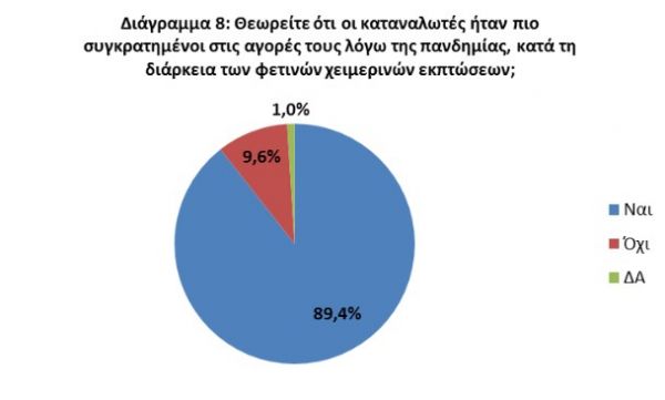 Σχεδόν 9 στις 10 επιχειρήσεις (89,4%) χαρακτήρισαν τους καταναλωτές πιο συγκρατημένους στις αγορές τους λόγω πανδημίας, με το αποτέλεσμα αυτό να δικαιολογείται με βάση τα παραπάνω ευρήματα της έρευνας. Σε παρόμοια επίπεδα είχαν κυμανθεί οι απαντήσεις και κατά τις θερινές εκπτώσεις (85%).