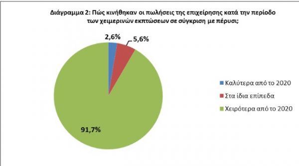 Για 2 στις 3 (66%) οι πωλήσεις των χειμερινών εκπτώσεων ήταν χειρότερες σε σχέση με τις προσδοκίες τους. Από την άλλη πλευρά, για μία στις τέσσερις επιχειρήσεις (26%) οι πωλήσεις στων εκπτώσεων κινήθηκαν στα αναμενόμενα επίπεδα, επίδοση ωστόσο βελτιωμένη σε σχέση με την αντίστοιχη των θερινών εκπτώσεων 2020 (12%). Το στοιχείο αυτό τεκμηριώνει την προσαρμογή των προσδοκιών των εμπορικών επιχειρήσεων στις έκτακτες συνθήκες της πανδημίας.
