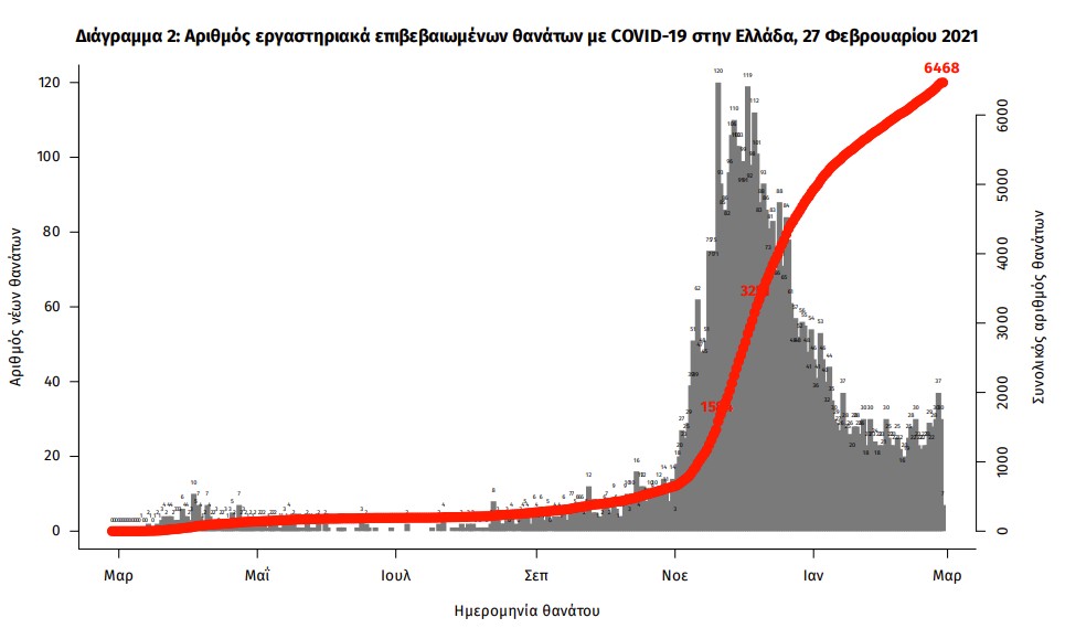 Οι νέοι θάνατοι ασθενών με COVID-19 είναι 29, ενώ από την έναρξη της επιδημίας έχουν καταγραφεί συνολικά 6.468 θάνατοι. Το 95.7% είχε υποκείμενο νόσημα ή/και ηλικία 70 ετών και άνω.