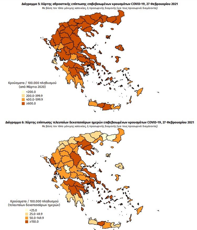 Με βάση τα επιβεβαιωμένα κρούσματα των τελευταίων 7 ημερών, 52 θεωρούνται σχετιζόμενα με ταξίδι από το εξωτερικό και 2.550 είναι σχετιζόμενα με ήδη γνωστό κρούσμα.