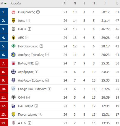 Η διαφορά από τη δεύτερη θέση αυξήθηξε, καθώς ο ΠΑΟΚ έχασε στην Τρίπολη (2-1) και έπεσε 3ος (46 βαθμοί). Δεύτερος ανέβηκε ο Άρης με 47 πόντους, ενώ πλέον οι «ερυθρόλευκοι» έχουν 61 βαθμούς. Τέταρτη με 45 βαθμούς η ΑΕΚ.