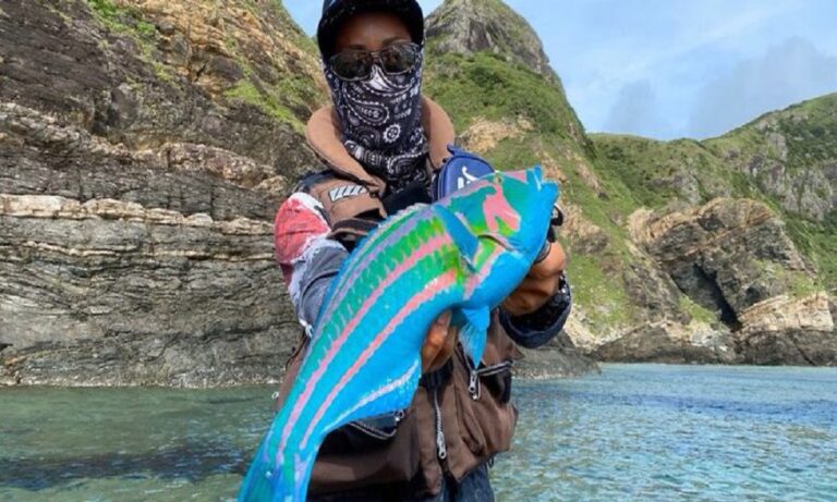 Σε νέον φούξια και γαλάζιους τόνους, η λεία του ψαρά μοιάζει κάθε άλλο παρά αληθινή.