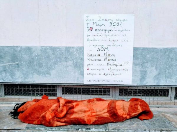«Σήμερα Δευτέρα 1η Μάρτη 2021 προχωρήσαμε σε μια συμβολική παρέμβαση έξω από το κτίριο της περιφέρειας Πελοποννήσου στην Καλαμάτα, για να δηλώσουμε την συμπαράστασή μας στις οικογένειες των προσφύγων (50 άνθρωποι μεταξύ των οποίων και μικρά παιδιά) που πρόκειται να βρεθούν στο δρόμο, μετά το κλείσιμο της δομής από τον ΔΟΜ (Διεθνής Οργανισμός Μετανάστευσης).