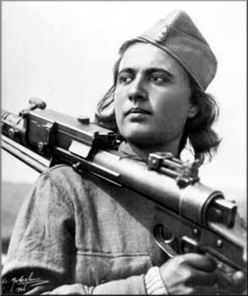 Τελευταία, πεντάμορφη στο ματωμένο πείσμα της, στη στυγνή της άρνηση να παραδοθή! Κ’ έσωσε όλες της τις γεμιστήρες! Τα σταυρωτά φισεκλίκια, πάνω στα στήθια της, με τους τροχιοδεικτικούς κρουσιφλεγείς θανάτους, κ’ η ζώνη η αρματωμένη – δύο σμιθ για θάνατο!