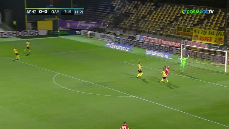 Ο Ολυμπιακός είχε την πρώτη πραγματικά καλή ευκαιρία στο ματς με τον Άρη στο Κλεάνθης Βικελίδης, με τους ερυθρόλευκους να φτάνουν πολύ κοντά στο 0-1.