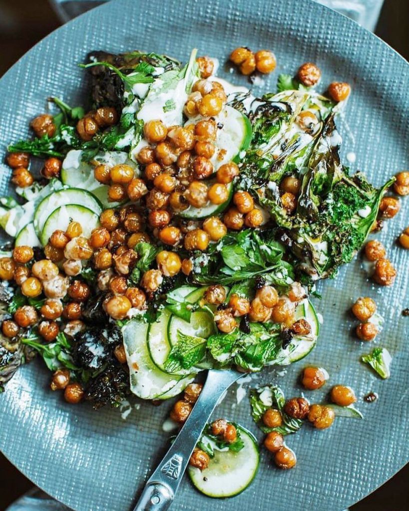 Αυτή η σαλάτα είναι αρκετά χορταστική ώστε να αποτελεί κυρίως πιάτο. Τα ρεβίθια είναι σκορδάτα και γεμάτα γεύση από τα μπαχαρικά (κύμινο & πάπρικα) ενώ το ταχίνι, ο δυόσμος και το αγγούρι προσφέρουν δροσιά στο πιάτο.