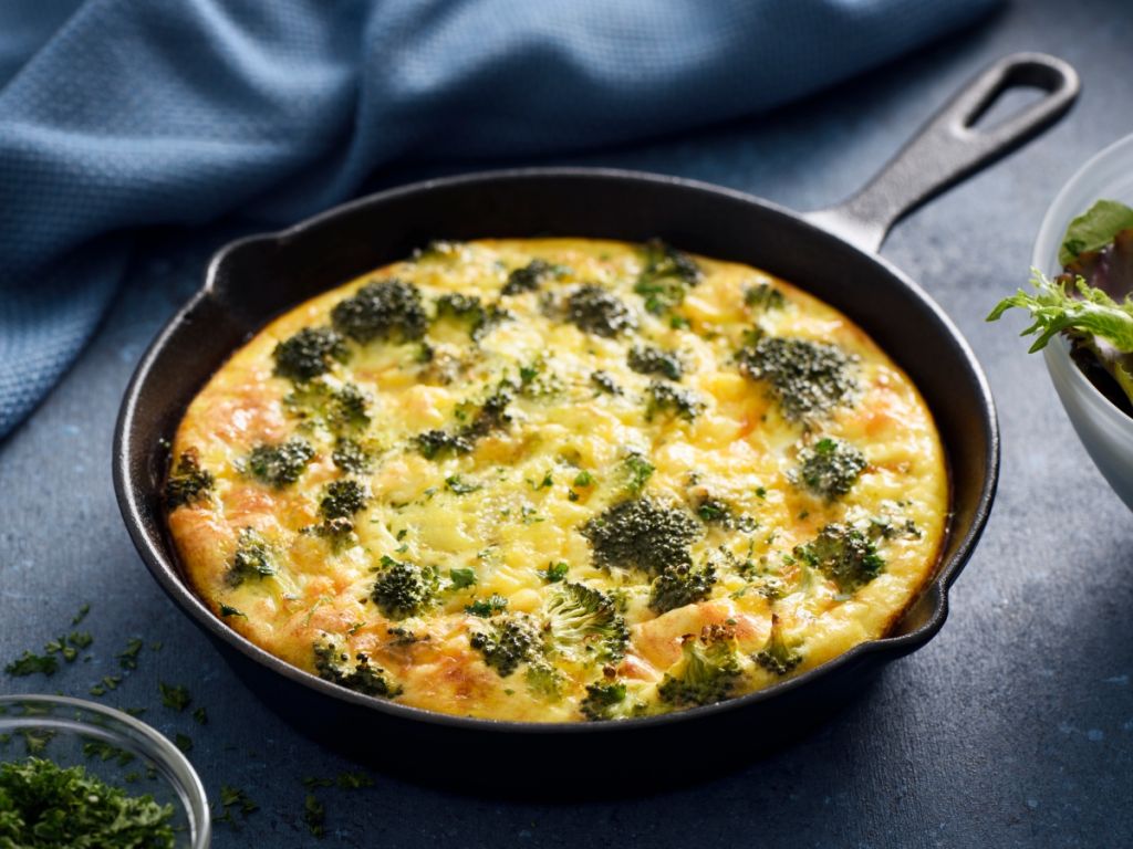 1 κουτ. της σούπας βούτυρο ανάλατο 1/2 κρεμμύδι, λιωμένο 2 φλιτζάνια μπρόκολο, καθαρισμένο και κομμένο σε μερίδες 7 μεγάλα αβγά 1 φλιτζάνι φέτα, τριμμένη αλάτι και πιπέρι