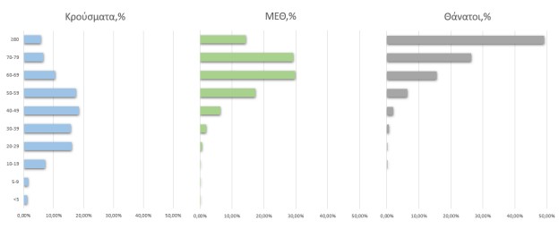 Ακολούθως παρουσιάζεται η ηλικιακή κατανομή των (α) συνολικών κρουσμάτων, (β) των περιστατικών που κατέληξαν σε θάνατο και (γ) των ασθενών που νοσηλεύονται διασωληνωμένοι: