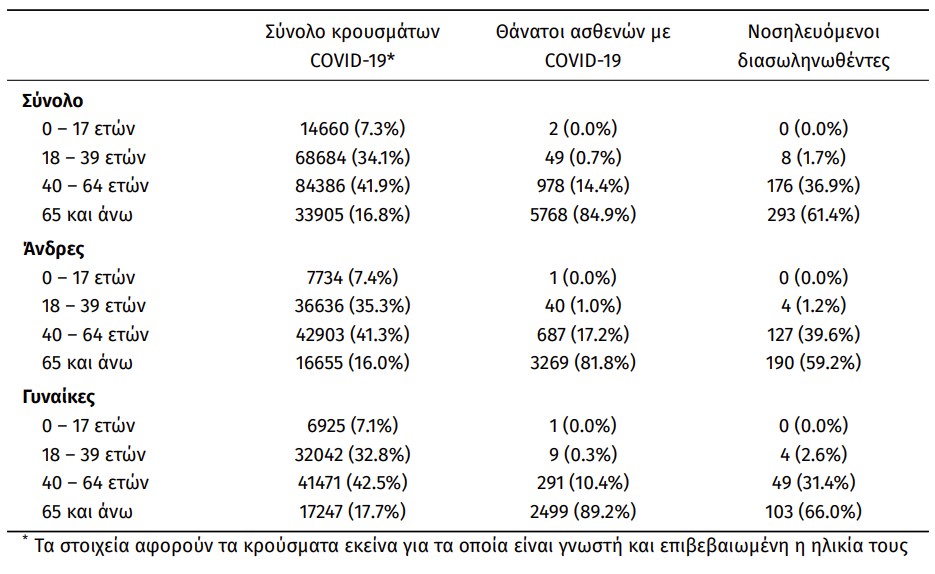 Οι νέοι θάνατοι ασθενών με COVID-19 είναι 39, ενώ από την έναρξη της επιδημίας έχουν καταγραφεί συνολικά 6.797 θάνατοι. Το 95.7% είχε υποκείμενο νόσημα ή/και ηλικία 70 ετών και άνω.