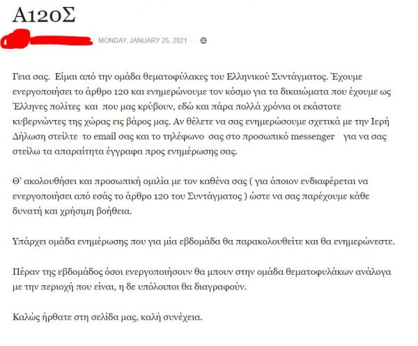 Στη σελίδα τους στο Facebook με ονομασία «ΕΠΙΘΕΣΗ ΕΛΛΗΝΩΝ Α120Σ», οι «θεματοφύλακες» επικαλούνται το Α120Σ.