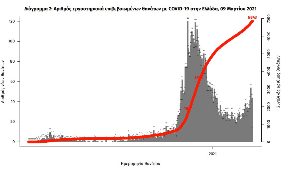 Οι νέοι θάνατοι ασθενών με COVID-19 είναι 46, ενώ από την έναρξη της επιδημίας έχουν καταγραφεί συνολικά 6.843 θάνατοι. Το 95.8% είχε υποκείμενο νόσημα ή/και ηλικία 70 ετών και άνω.