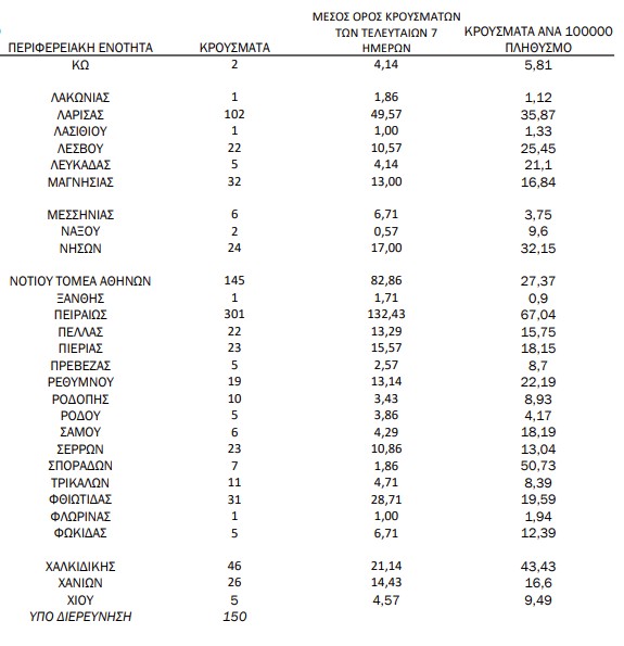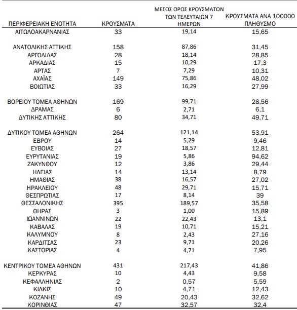 Τέλος, Δυτική Αττική και νησιά του Αργοσαρωνικού καταγράφουν 80 και 24 κρούσματα αντίστοιχα.