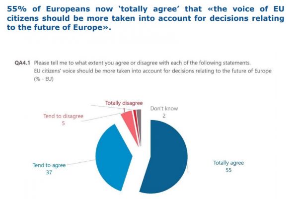 Μολονότι η ψήφος στις ευρωπαϊκές εκλογές θεωρείται σαφώς (από το 55% των ερωτηθέντων) ο αποτελεσματικότερος τρόπος για να διασφαλιστεί ότι οι φορείς λήψης αποφάσεων σε επίπεδο ΕΕ ακούνε τη φωνή των πολιτών, υποστηρίζεται σθεναρά ότι οι πολίτες της ΕΕ θα πρέπει να έχουν μεγαλύτερο λόγο στις αποφάσεις που αφορούν στο μέλλον της Ευρώπης. Από το 92% που πιστεύει ότι η φωνή των πολιτών της ΕΕ θα πρέπει να λαμβάνεται περισσότερο υπόψη, το 55% «συμφωνεί απόλυτα» και το 37% «μάλλον συμφωνεί». Μόνο το 6% διαφωνεί με τη δήλωση.