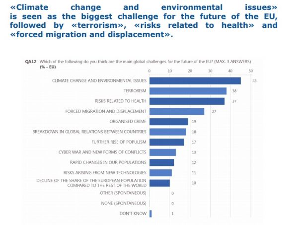 Η κλιματική αλλαγή θεωρείται σαφώς η κύρια παγκόσμια πρόκληση που επηρεάζει το μέλλον της ΕΕ, καθώς το 45% των Ευρωπαίων επέλεξε την εν λόγω πρόκληση ως την κυριότερη. Το δεύτερο και το τρίτο συχνότερα αναφερθέν ζήτημα, με παρόμοια ποσοστά, είναι η τρομοκρατία (38%) και οι κίνδυνοι που συνδέονται με την υγεία (37%). Η αναγκαστική μετανάστευση και ο εκτοπισμός είναι η τέταρτη συχνότερα αναφερθείσα πρόκληση, την οποία ανέφερε λίγο πάνω από το ένα τέταρτο των Ευρωπαίων (27%). Ακολουθούν το οπργανωμένο έγκλημα (19%), η παγκόσμια κατάρρευση των διακρατικών σχέσων (18%), η περαιτέρω αύξηση του λαϊκισμού (17%), ο ψηφιακός πόλεμος και οι νέες μορφές συγκρούσεων (13%), οι δραστικές αλλαγές στους πληθυσμούς (12%), οι κίνδυνοι που εγκυμονούν από την ανάπτυξη νέων τεχνολογιών (11%) και η μείωση του ευρωπαϊκού πληθυσμού συγκριτικά με αυτόν στον υπόλοιπο κόσμο (10%).
