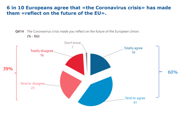 Έξι στους δέκα Ευρωπαίους συμφωνούν ότι η κρίση του κοροναϊού τούς έκανε να προβληματιστούν σχετικά με το μέλλον της Ευρωπαϊκής Ένωσης (το 19% «συμφωνεί απόλυτα» και το 41% «μάλλον συμφωνεί»), ενώ το 39 % διαφωνεί ως προς αυτό (το 23% «μάλλον διαφωνεί» και το 16% «διαφωνεί εντελώς»).