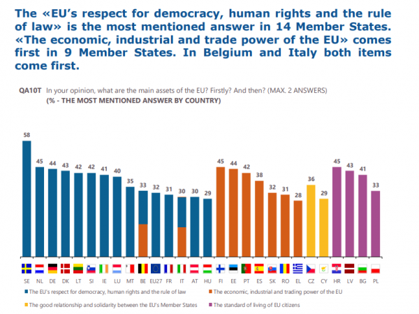 Οι Ευρωπαίοι θεωρούν ότι ο σεβασμός της ΕΕ για τη δημοκρατία, τα ανθρώπινα δικαιώματα και το κράτος δικαίου (32%), καθώς και η οικονομική, βιομηχανική και εμπορική της δύναμη (30%), αποτελούν τα κύρια πλεονεκτήματά της. Ο σεβασμός της ΕΕ για τη δημοκρατία, τα ανθρώπινα δικαιώματα και το κράτος δικαίου κατατάσσεται ως το σημαντικότερο (ή κοινό σημαντικότερο) πλεονέκτημα σε 14 χώρες, και η άποψη αυτή κυριαρχεί ιδίως στη Σουηδία, όπου το 58% θεωρεί ότι αυτό αποτελεί βασικό πλεονέκτημα. Η οικονομική, βιομηχανική και εμπορική δύναμη της ΕΕ κατατάσσεται ως το σημαντικότερο πλεονέκτημα (μόνο του ή συνδυαστικά με άλλα πλεονεκτήματα) σε εννέα χώρες – με επικεφαλής τη Φινλανδία (45%) και την Εσθονία (44%) – μεταξύ των οποίων και η Ελλάδα (28%).