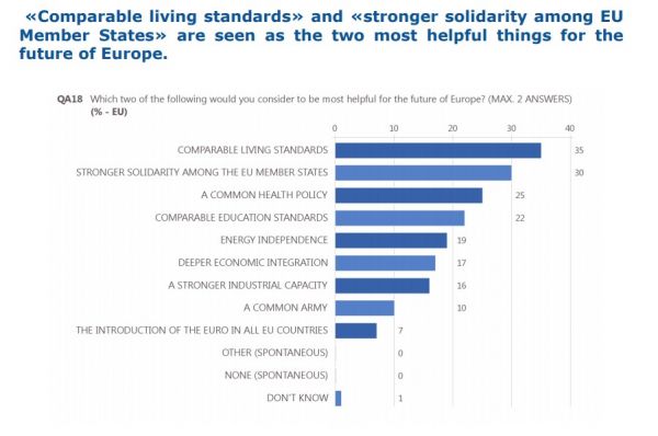 Οι ερωτηθέντες κλήθηκαν να επιλέξουν τις εξελίξεις που επιθυμούν να δουν όσον αφορά το μέλλον της Ευρώπης: η ύπαρξη συγκρίσιμου βιοτικού επιπέδου (35%) και ισχυρότερης αλληλεγγύης μεταξύ των κρατών-μελών (30%) είναι οι δύο πιο συχνά αναφερθείσες εξελίξεις. Οι Ευρωπαίοι δίνουν επίσης προτεραιότητα στην ανάπτυξη κοινής πολιτικής για την υγεία (25%) και συγκρίσιμων εκπαιδευτικών προτύπων (22%). Ακολουθούν η ενεργειακή αυτονομία (19%), η οικονομική ολοκλήρωση (17%), η ισχυρότερη βιομηχανική ικανότητα (16%), ο κοινός ευρωπαϊκός στρατός (10%) και η υιοθέτηση του ευρώ από όλες τις χώρες της ΕΕ (7%).